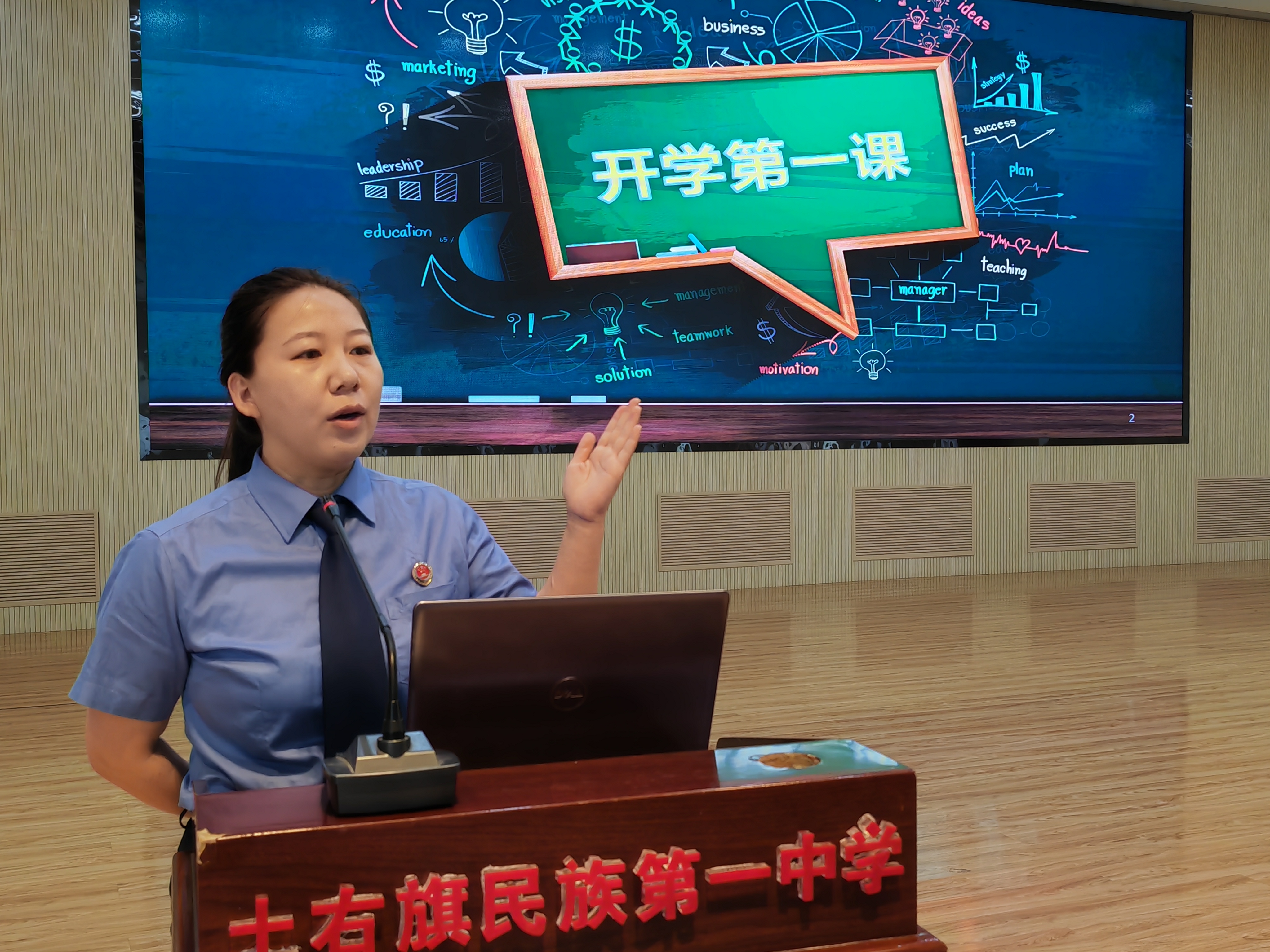 金秋九月,开学启航,新学期的序幕悄然拉开。为筑牢未成年人法治防线,守护青春不“触”法,深入贯彻落实《未成年人保护法》和《预防未成年人犯罪法》,切实加强未成年人法治教育,提升未成年人法治意识和自我保护能力,2025年9月4日上午,土右旗人民检察院检察官走进土默特右旗民族第一中学,开展“开学第一讲”法治教育活动,为师生们送上了一堂生动有趣、干货满满的法治课,为学生们的法治道路解锁法治密码。