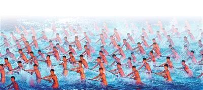 演员在十五运会闭幕式上表演划龙舟。 本报记者 蒋雨师摄 |