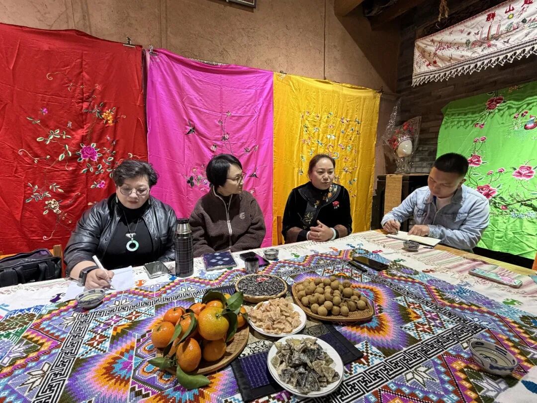 2025年11月14日,巴莫曲布嫫(左二)在云南省大理市喜洲镇周城村访谈白族刺绣市级代表性传承人杨美池。