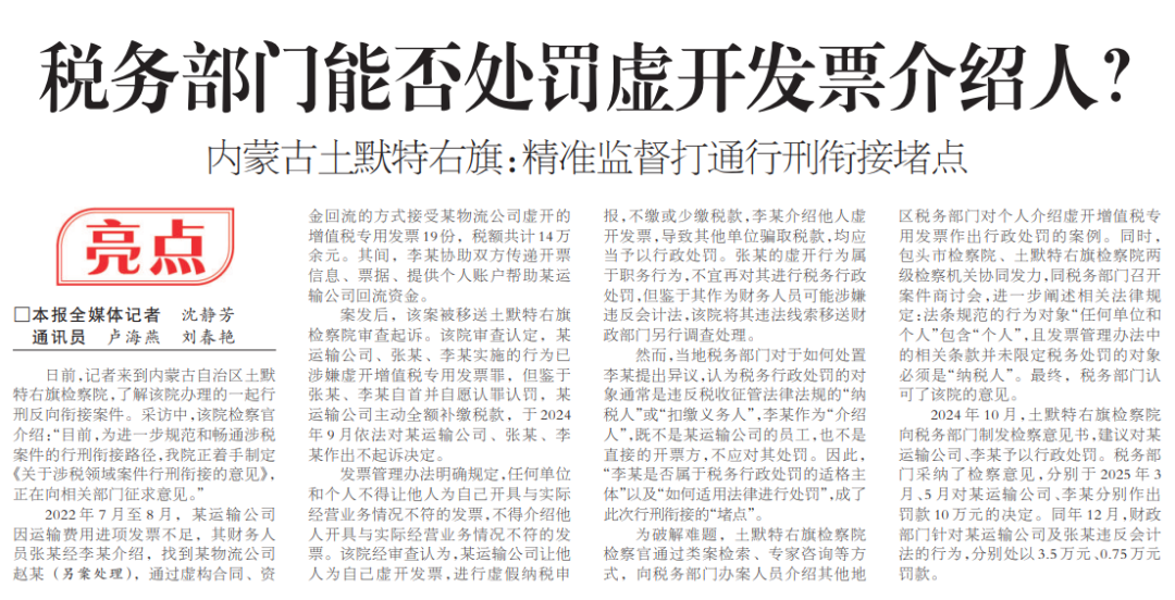 为破解难题,土默特右旗检察院检察官通过类案检索、专家咨询等方式,向税务部门办案人员介绍其他地区税务部门对个人介绍虚开增值税专用发票作出行政处罚的案例。同时,包头市检察院、土默特右旗检察院两级检察机关协同发力,同税务部门召开案件商讨会,进一步阐述相关法律规定:法条规范的行为对象“任何单位和个人”包含“个人”,且发票管理办法中的相关条款并未限定税务处罚的对象必须是“纳税人”。最终,税务部门认可了该院的意见。